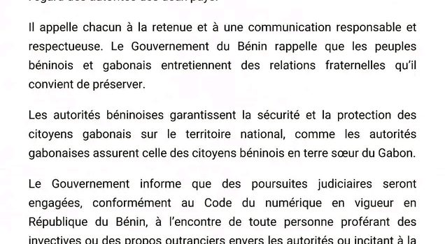 Dans un communiqué officiel, le ministère des Affaires étrangères du Bénin invite à la retenue et encourage une communication responsable et respectueuse. Il rappelle que les peuples béninois et gabonais entretiennent depuis toujours des relations fraternelles qu’il convient de préserver.