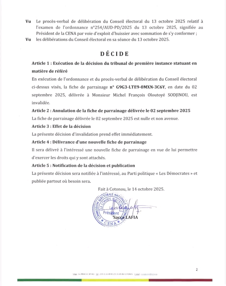 La Commission électorale nationale autonome a rendu publique, ce mardi 14 octobre 2025, une décision portant invalidation de la fiche de parrainage n° G9G3-LTE9-0MXN-3C6Y, précédemment délivrée au député Michel François Oloutoyé Sodjinou membre du parti Les Démocrates.