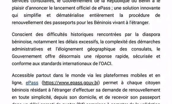 Le Gouvernement du Bénin franchit une nouvelle étape dans la modernisation de ses services consulaires avec le lancement officiel de ePass, une plateforme numérique innovante destinée aux Béninois de la diaspora. Cette solution vise à simplifier et dématérialiser entièrement la procédure de renouvellement des passeports.