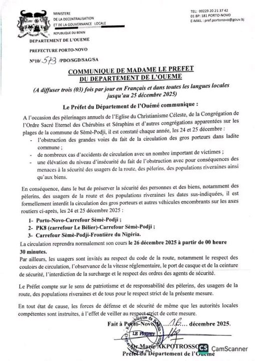 Parmi ces dispositions figure l’interdiction de circulation des camions les 24 et 25 décembre 2025 sur trois axes routiers : le tronçon Porto-Novo – carrefour Sèmè-Podji, l’axe PK8 (carrefour Le Bélier) – carrefour Sèmè-Podji, ainsi que la route reliant le carrefour Sèmè-Podji à la frontière nigériane. Par ailleurs, les usagers de la route sont invités au strict respect du Code de la circulation. Lire l’intégralité du communiqué préfectoral.