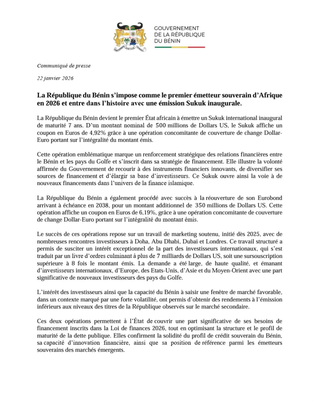 En devenant le premier émetteur souverain africain de l’année 2026, la République du Bénin marque un tournant majeur. Avec le lancement de son premier Sukuk international et la réouverture d’un Eurobond, le pays a levé un total de 850 millions de dollars, confirmant l’attrait croissant des investisseurs pour la signature béninoise.