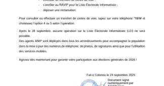 A LA UNE Vote 2026: encore quelques jours pour l’identification RAVIP Jeanne Clodette SODJINOUseptembre 24, 20250 L’Agence nationale d’identification des personnes (ANIP) rappelle à tous les citoyens béninois que la date limite...